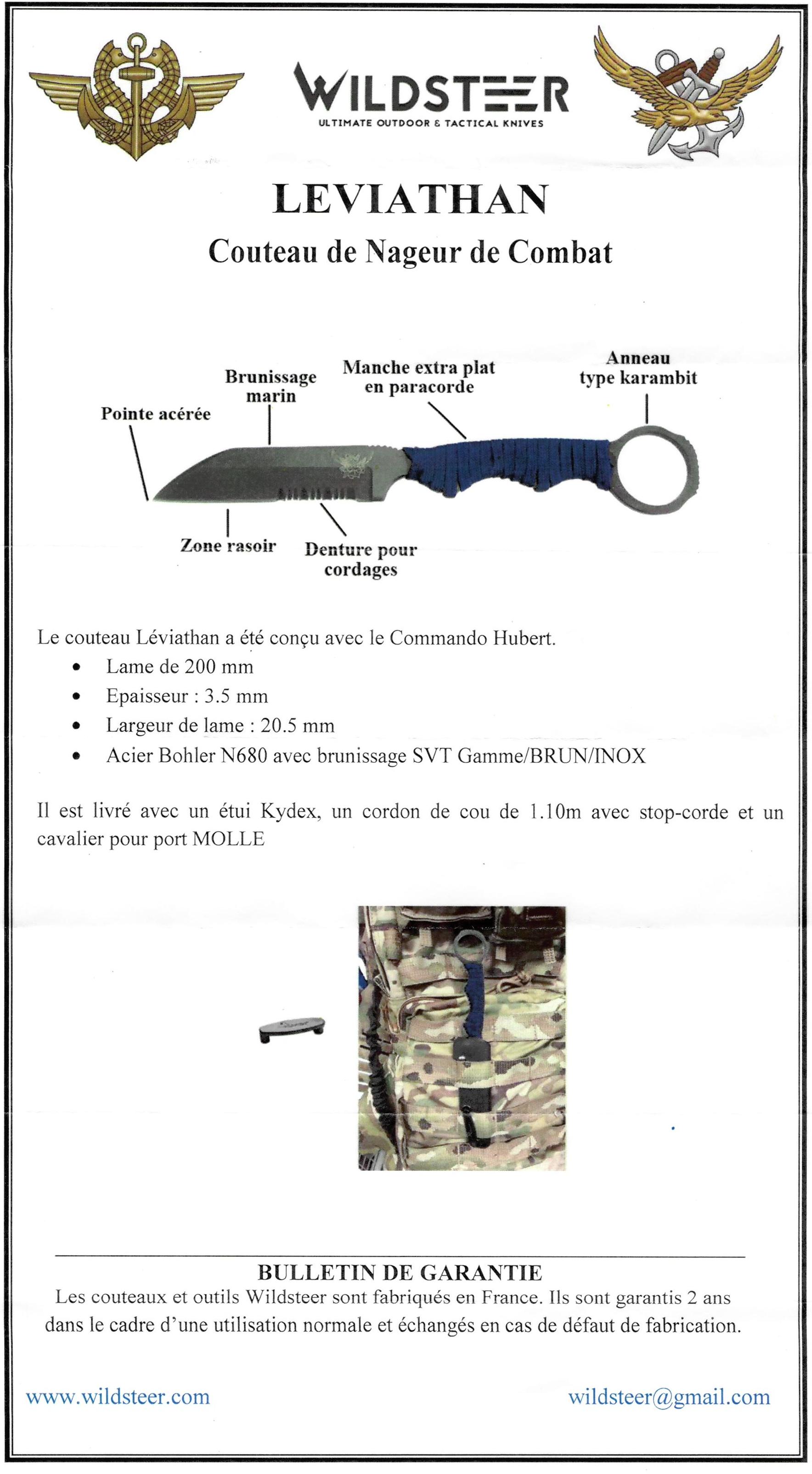 | Il doit également servir au combat qui est le coeur même de l'activité des Nageurs de Combat avec une pointe acérée possédant un haut pouvoir de pénétration, un très bon grip pouvant être utilisé avec ou sans gants et un manche avec un anneau pour une prise en main type "karambit", en plus d'une extraction aisée. Afin de garantir une grande résistance à l'abrasion et de garder une qualité de coupe en toute circonstance, l'acier choisi est le N680 de Böhler performé avec une finition miroir microbillée, combinée à un "brunissage" de qualité marine sur toute la longueur du couteau. Les essais conduits sur différents continents, à l'entraînement puis en opérations, à terre, sur l'eau et sous l'eau font émerger le "LEVIATHAN", monstre mythologique créant le chaos dans les mers. Le Léviathan est destiné à toutes les opérations maritimes, raids, assauts mer, actions vers la terre, et pour tous ceux qui combattent et œuvrent en milieu marin. De par sa conception, le Léviathan se trouve de facto adapté au milieu désertique. | |