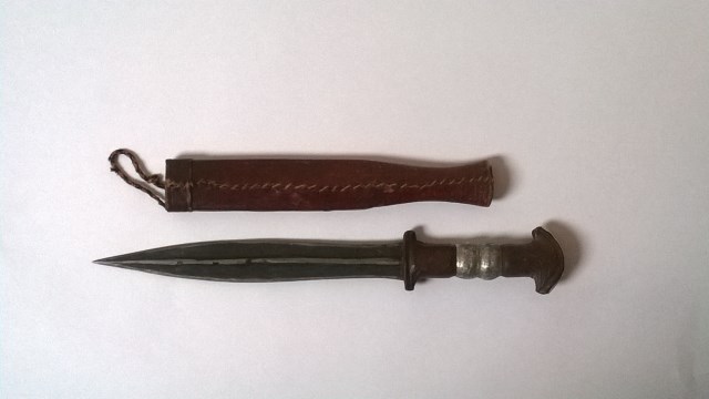 Couteau tradionnel du Cameroun, manche en bois recouvert de cuir, deux bagues en aluminium sont au milieu.