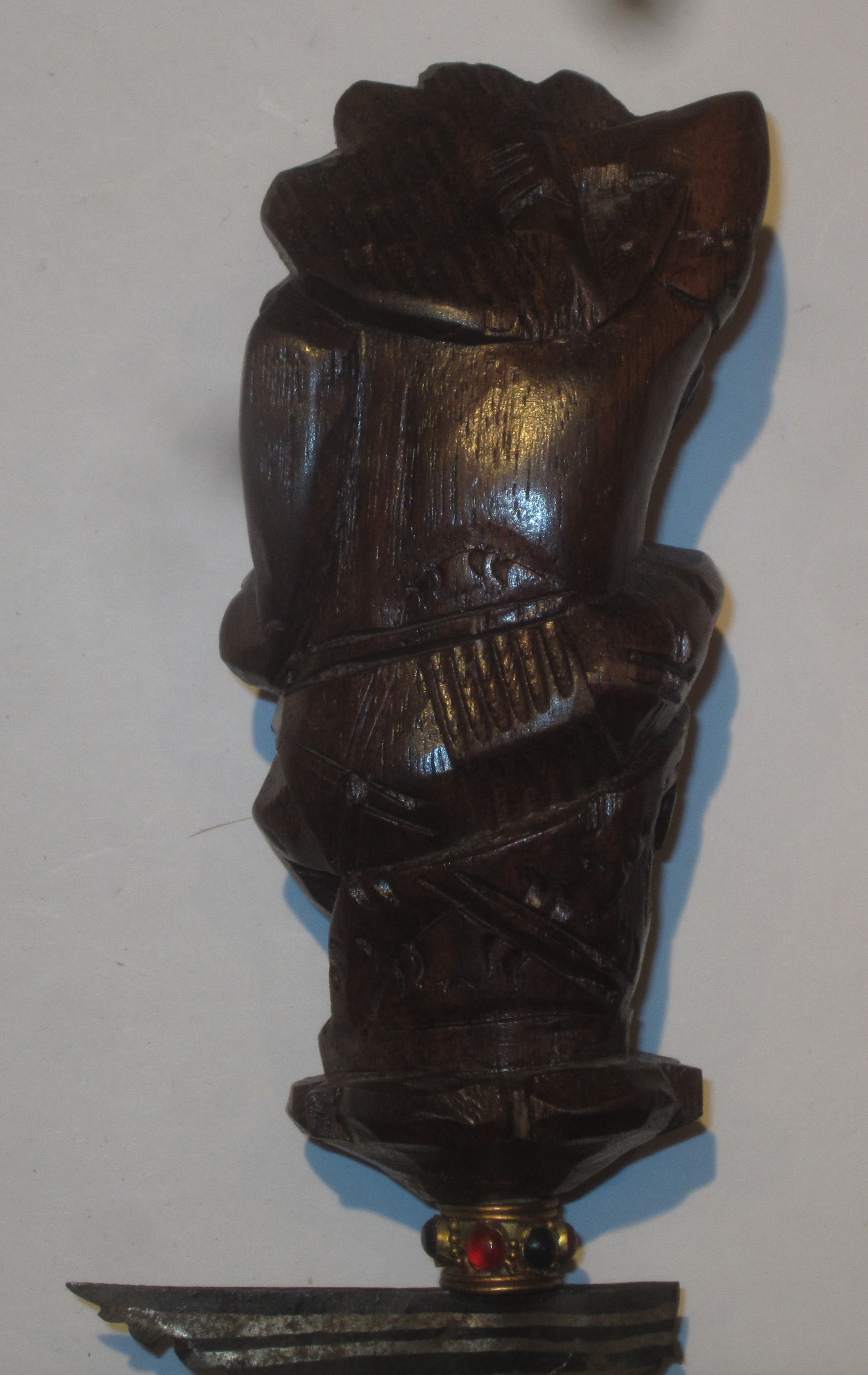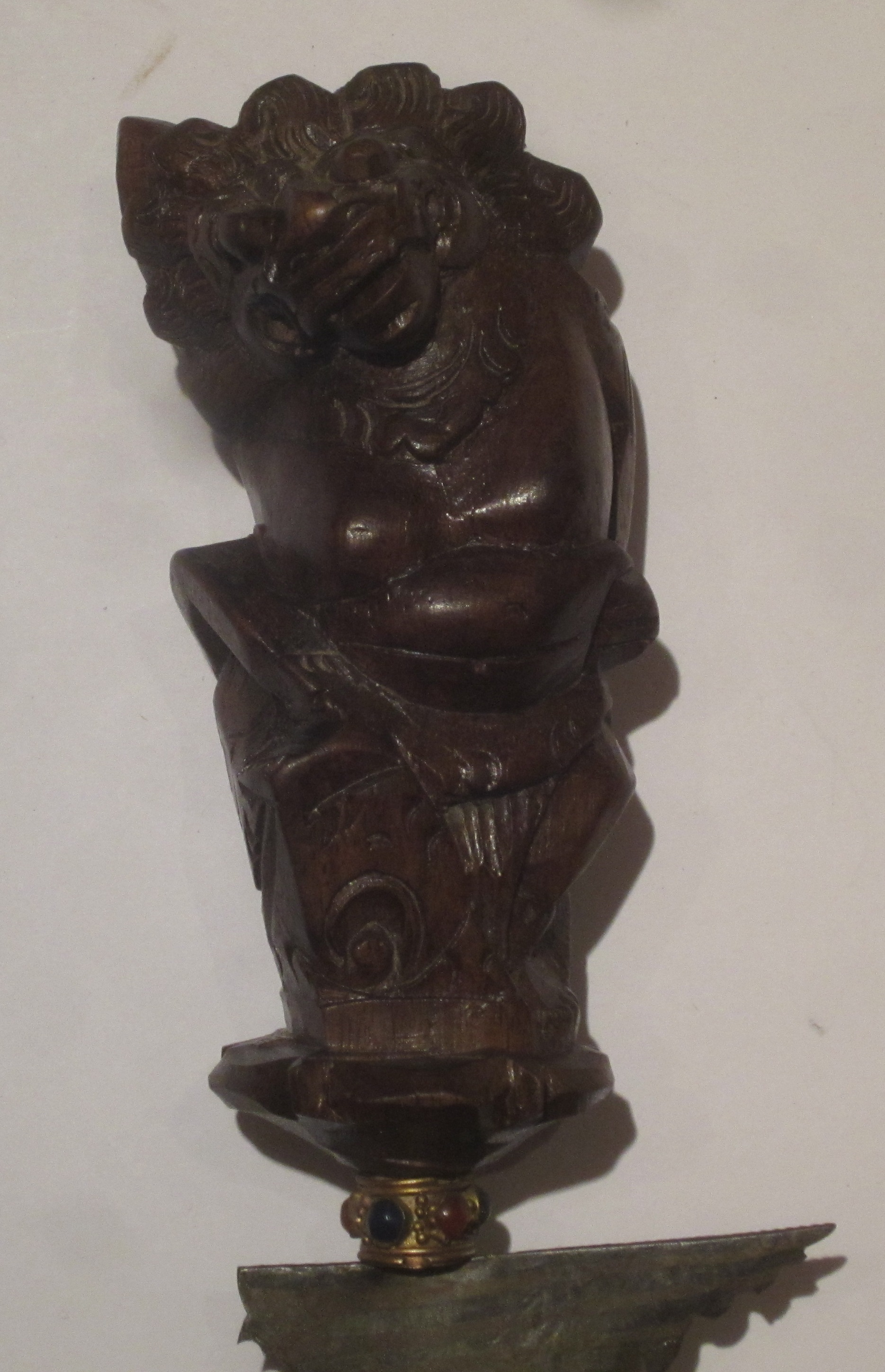 | Ce poignard a une lame ondulée en fer forgé. La poignée est en forme de créature fantastique, tandis que le fourreau est orné de masques et d’entrelacs. Ils sont réalisés dans un bois apparemment dense, ayant permis de sculpter ces motifs avec finesse. L’ensemble doit mesurer une cinquantaine de centimètres. L’originalité de la forme et du décor indique un travail d’Indonésie ou de Malaisie. Cette arme, appelée « kriss », est un attribut caractéristique des peuples malais, et se porte attachée dans le dos. Objet de cérémonie Sa valeur symbolique est très importante pour son possesseur. Le kriss est réalisé par un forgeron en présence de son commanditaire, au cours d’un rituel précis. Il ne peut être utilisé contre un autre être vivant, car il perdrait alors son énergie spirituelle. D’après la tradition malaise, cette arme est détentrice de l’âme de son possesseur. Elle ne s’achète pas et se transmet de père en fils. Un homme se mariant par procuration peut même être représenté par son kriss ! De plus petits modèles, mesurant entre 20 et 30 cm, étaient portés par des femmes ou des enfants. De nombreux kriss ont été rapportés comme souvenirs de voyage par des Occidentaux au début du XXe siècle. |