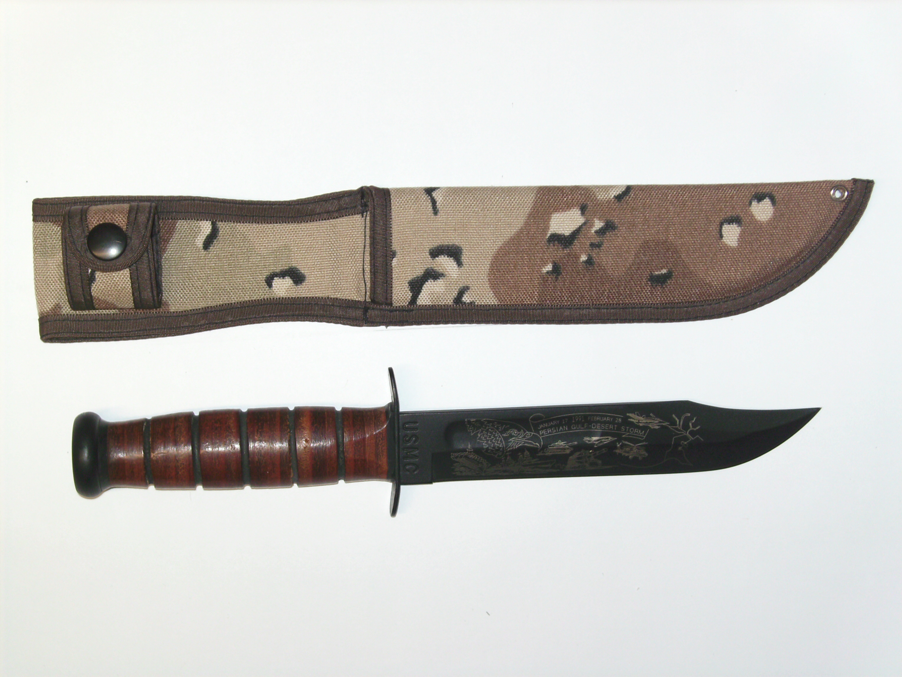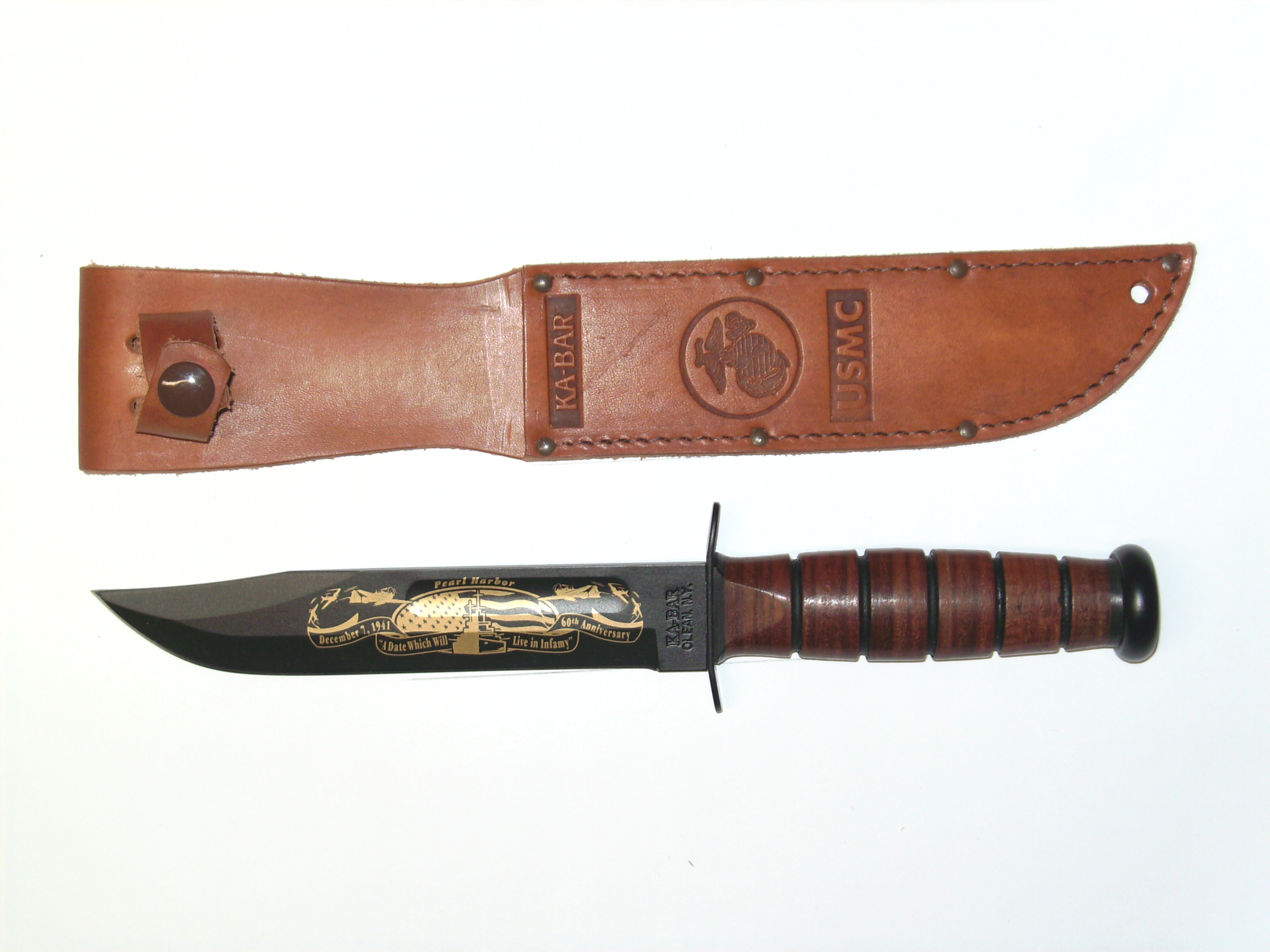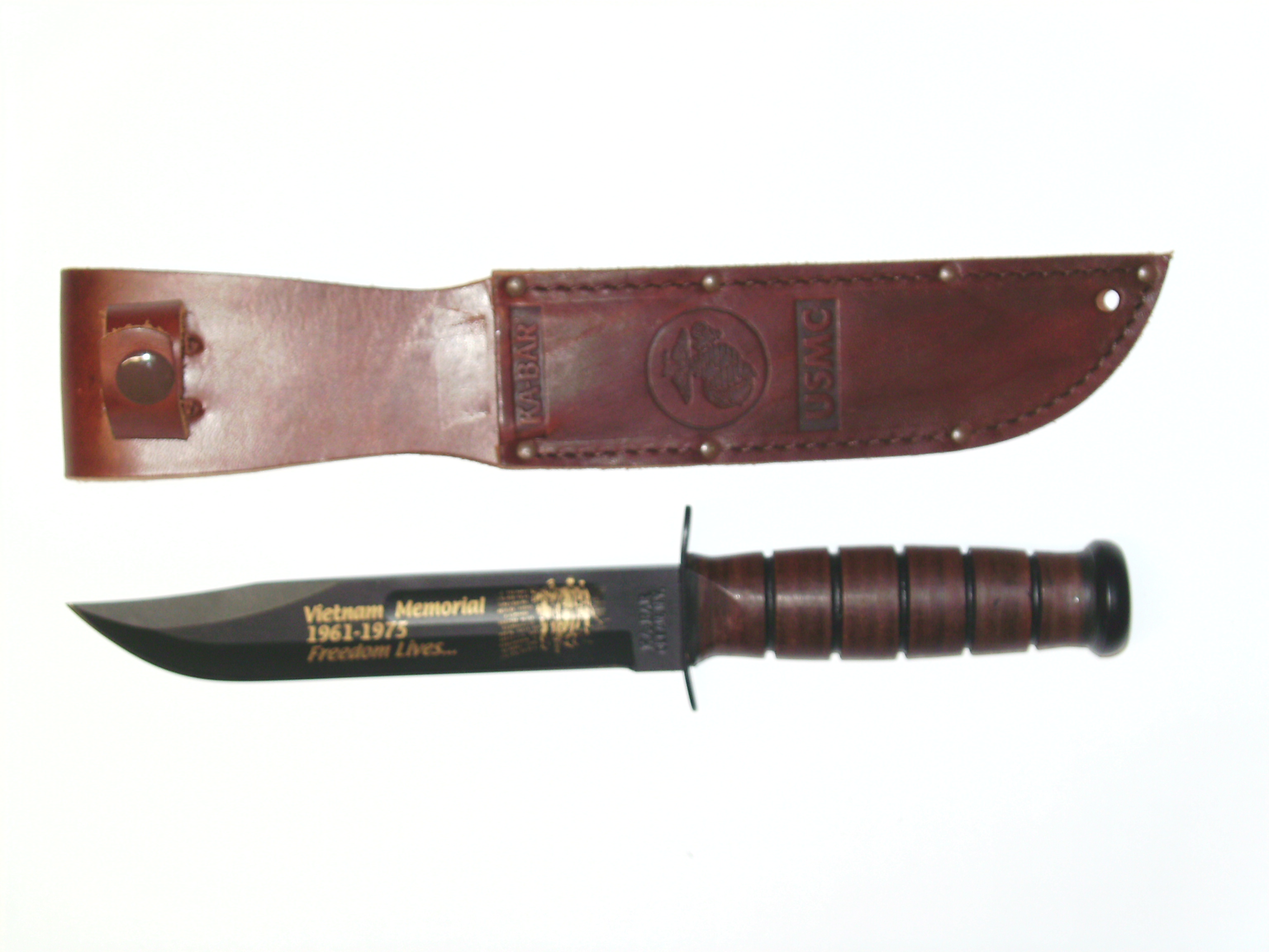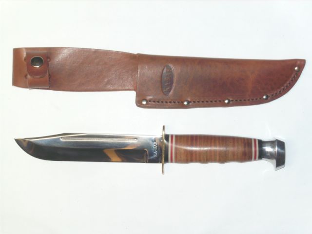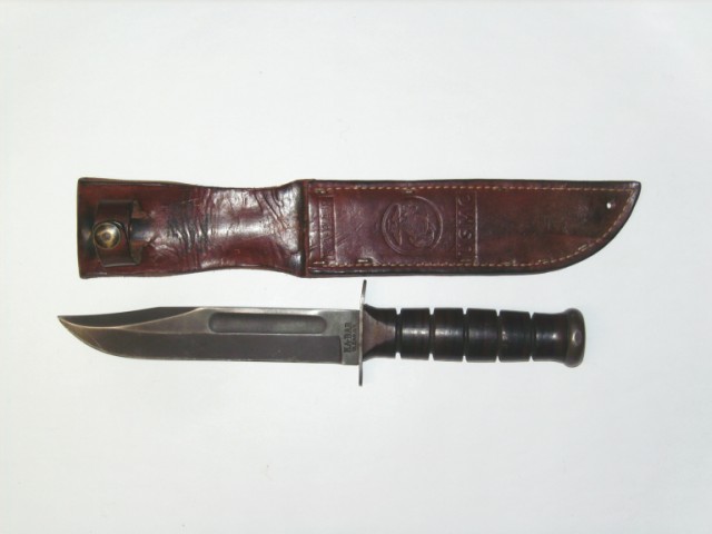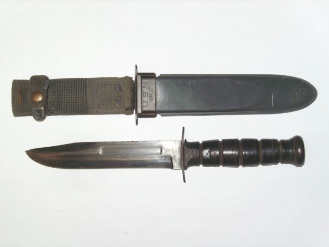 Leather Serie Marine Le légendaire couteau des Marines durant WWII. Notez l'aspect "civil "du fourreau de cuir,marquage derriere celui-ci 289-74-7375 , mais cela ressemble belle et bien à un numéro de contrat de la fabrication Ce couteau servit encore en Corée et au Vietnam. L'U.S. Navy adopta un autre couteau de combat l'USN Mark 2 qui était en fait,une copie conforme du Fighting & Utility Knife de l'U.S.M.C.Fabriqué par KA-BAR.La difference entre le KA-BAR réside dans les seuls marquages.Le foureau U.S.N.MK2 au dos Nord 4723 B.M.Co .vp