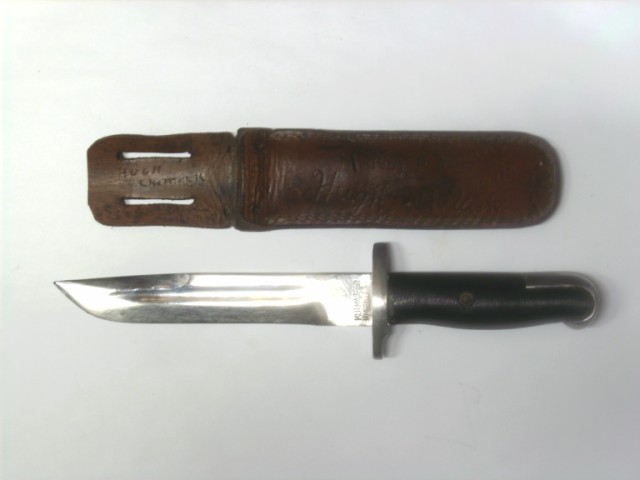 Kutmaster Utica.NY.Quelques marquages sur le fourreau HUGH CHITTICK, un coeur avec le prénom PATSY.Et il semblerai ausi une date 26.06.1940, et une morsure a l'extremité du fourreau.