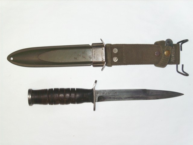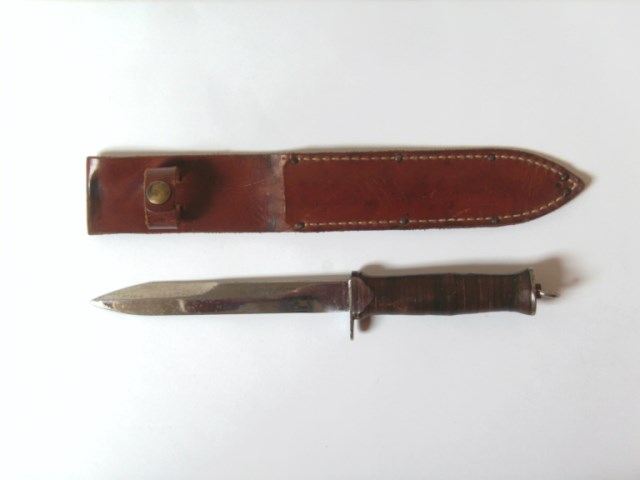 Kutmaster : Ce couteau civil de combat est tiré de la bayonnette M4 dont on a coupé l'anneau; les rondelles de cuir de la poignée ont été changées et le pommeau est garni d'un anneau.Le nom du fabriquant est gravé à l'acide sur la lame.