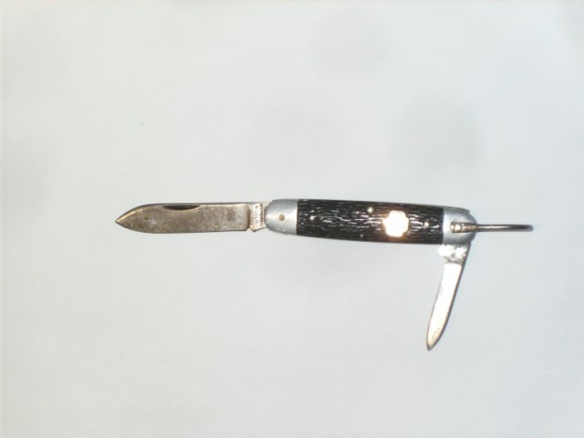 Couteau de poche à très grande bélière. Cette marque était située à New York. Le talon de la lame porte marqué : UTICA FEATHERWEIGHT PAT. APL. (featherweight : poids plume). Dimensions : fermé, 8,6cm lame, 6,7cm. Les mitres sont en aluminium car à cette époque, le cuivre est réservé à la guerre. Le blason sur le côté est gravé GS du nom de son propriétaire.