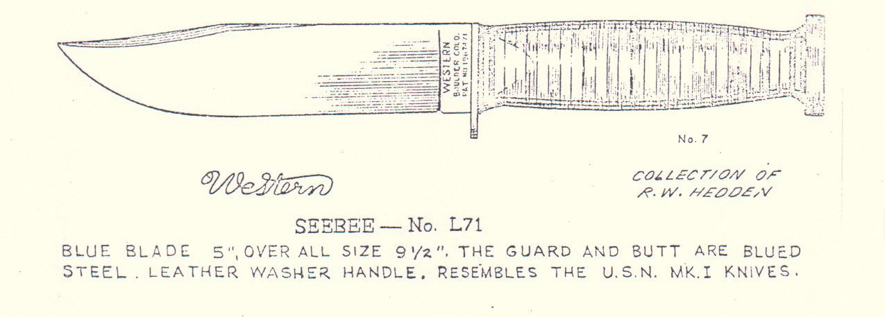 | Western SEEBEE fabriqué à Boulder dans le Colorado par Western Cutlery. Il était acheté officiellement par l´US Navy lors de la Seconde Guerre avec d´autres modèles de chez Western. Sa fabrication a débuté après l´attaque de Pearl Harbour. Ce couteau qui peut être assimilé à la famille des MK1 a une lame au bronzage bleu nuit. Il posséde un étui cuir custom. . Il en existe une réplique fabriquée en 1985, l'USN Western L71 Western Cutlery Co, fabricant qui avait débuté en 1911 à Boulder, Colorado, a disparu en 92 |