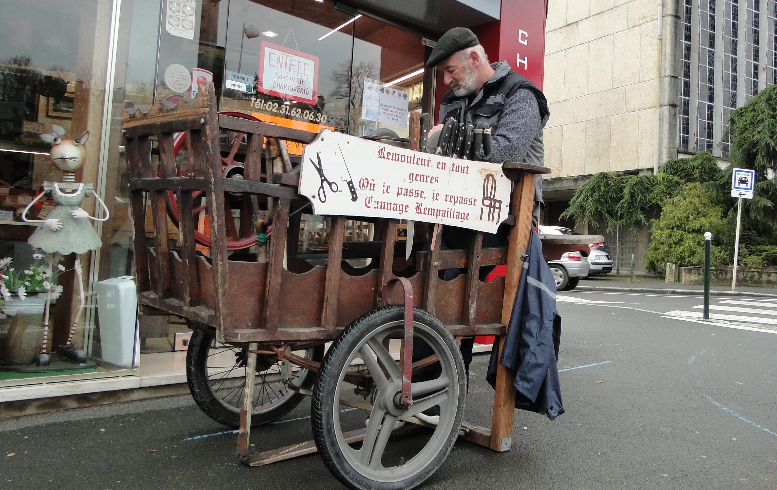 | l 'émouleur qui travaille toute la journée couché à plat-ventre, aiguisant des pièces de coutellerie sur une petite meule placée au-dessous de leur tête. | Artisan, le plus souvent ambulant, qui aiguise les couteaux, les ciseaux et autres objets tranchants sur une meule généralement à pédale qu'il déplace avec lui. | |||